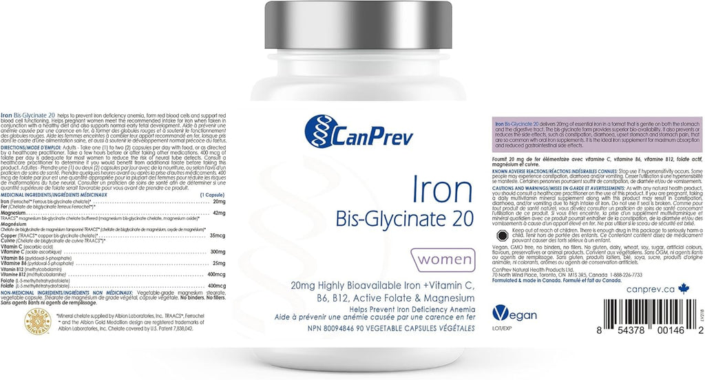 CanPrev’s Iron Bis·Glycinate 20 contains iron bisglycinate, a chelated iron that is easy to absorb, gentle on the stomach and doesn’t cause gastrointestinal upset like those that contain ferrous sulphate can.
