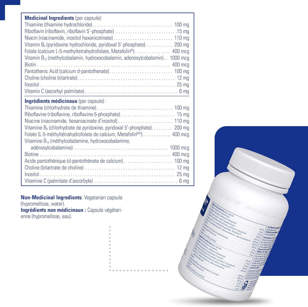 B6 Complex offers a comprehensive blend of B vitamins with high levels of vitamin B6 packed into one easy-to-take supplement. B vitamins support cellular, cardiovascular, neurological, and cognitive health, while vitamin B6 is particularly supportive of nutrient metabolism and red blood cell formation. It is offered in this formula as both pyridoxine and the activated form pyridoxal-5-phosphate. Vitamin B12, which aids in energy metabolism and normal function of the immune system, is offered as a combination of methylcobalamin, adenosylcobalamin, and hydroxocobalamin. Folate, provided as Metafolin® L-5-MTHF, the universally metabolized and biologically active form of folate, supports normal early development of the fetal brain and spinal cord, while biotin helps to maintain cognitive functions. B vitamins are also involved in methylation reactions alongside choline and inositol.
